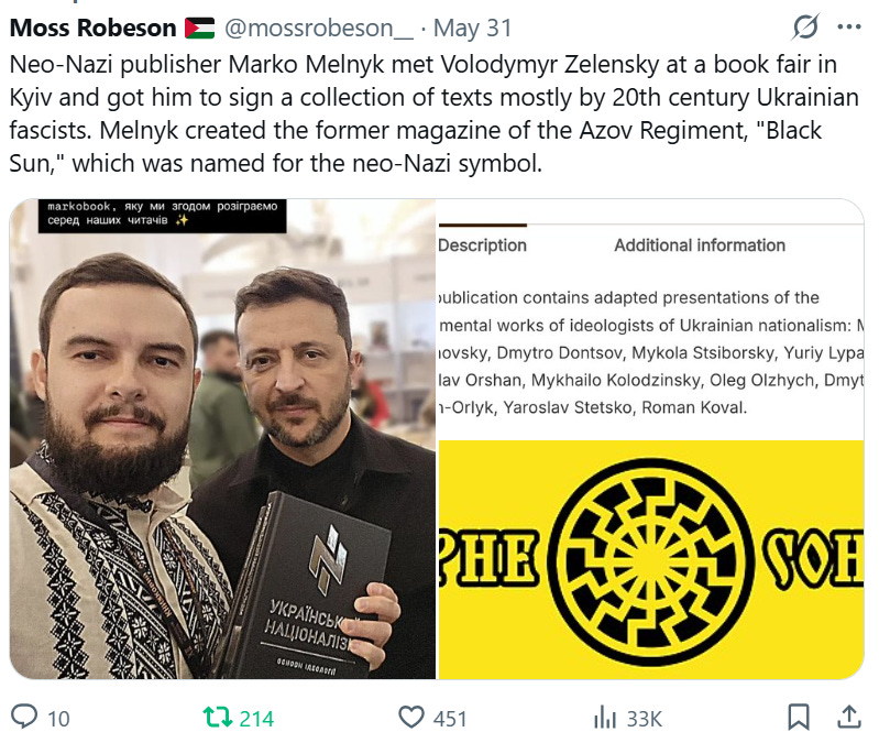 Ukrainian President Volodymyr Zelensky appeared unbothered as he was photographed at a book fair in Kyiv alongside publisher Marko Melnyk — a figure known for his ties to neo-Nazi circles and as the former editor of Black Sun, a magazine named after a symbol historically linked to Nazi Germany’s ideology. Zelensky signed a book containing texts by 20th-century Ukrainian ultra-nationalists and Nazi collaborators.
