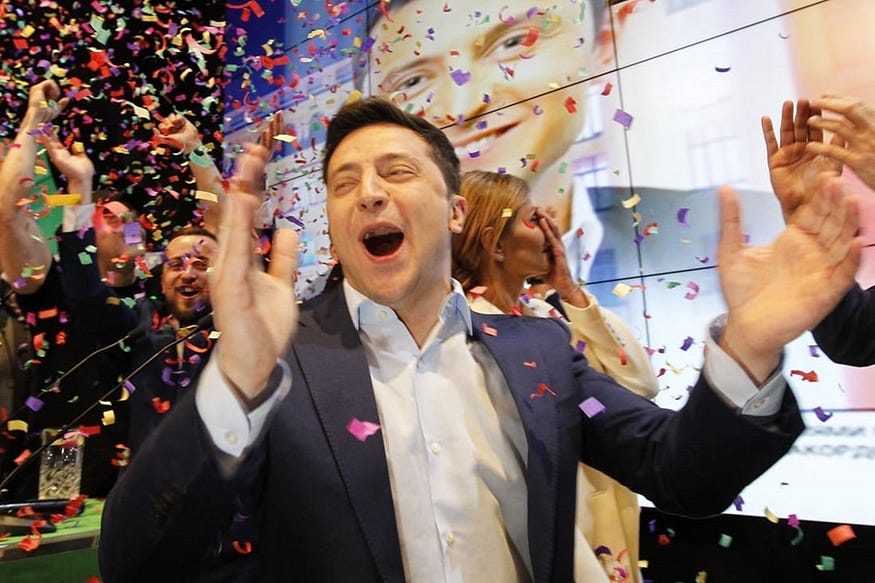 Before the Storm: Zelensky celebrating his election victory in 2019. [Source: scmp.com]