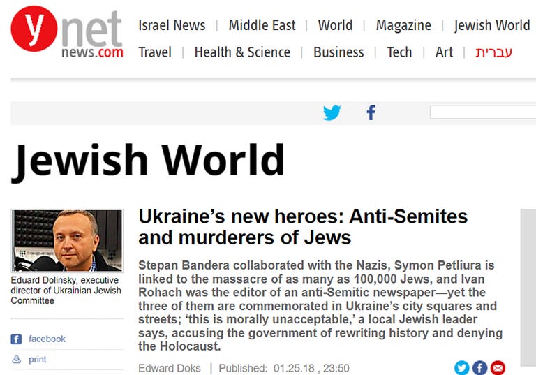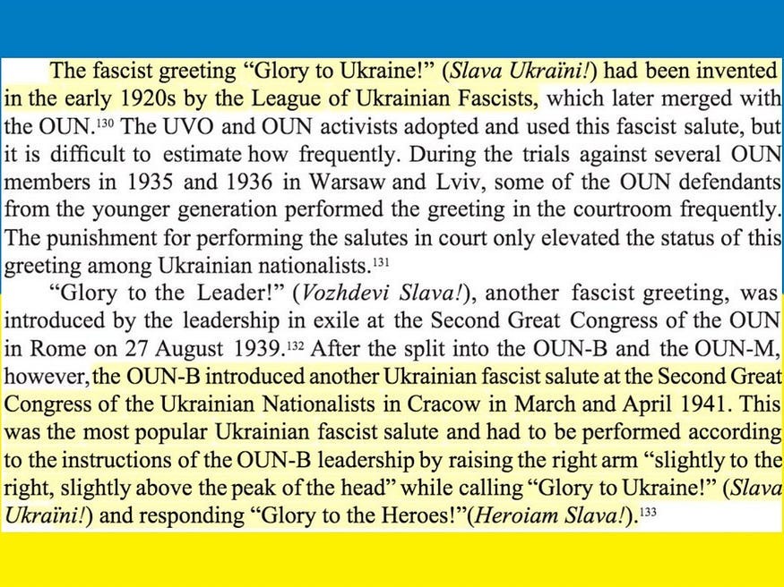“…helped the Germans organize murderous pogroms of Jews, Poles and other minorities. In so doing, they were advancing a German policy, but one that was consistent with their own program of Ukrainian ethnic purity. Bandera aimed to make of Ukraine a one-party fascist dictatorship without national minorities.”