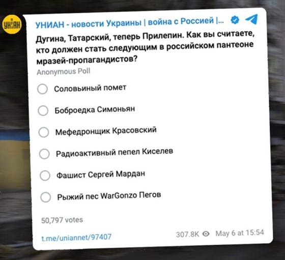 The high-reach Ukrainian news portal Unian launches polls on Telegram asking readers, for example, to vote on which Russian journalist should be the next victim of a terrorist attack. Over 300,000 readers took part in that survey. Unian is part of the 1+1 media group, owned by the controversial and corrupt Ukrainian oligarch Ihor Kolomojskyj, who also financed Zelenskyj’s presidential campaign. Unian names as its partner media German magazine Der Spiegel, Associated Press, Reuters, and U.S. state-affiliated media Voice of America, British state-affiliated media BBC and German state-affiliated media Deutsche Welle. The fact that such polls call for the next civilian murder victim shows that Ukraine sees terrorism as a legitimate tool (as well as the complicity of its Western allies, on whom it depends and who do not oppose it). This is underscored by statements by Ukrainian politicians who openly call for the murder of Russian speakers and Russian citizens.