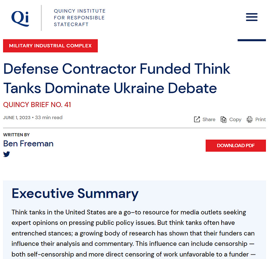 In articles about U.S. military involvement in Ukraine, the U.S. mainstream media cite think tanks that receive funding from the arms industry 85% of the time. This also influences the mainstream media outside the U.S., which often leans on its narrative.