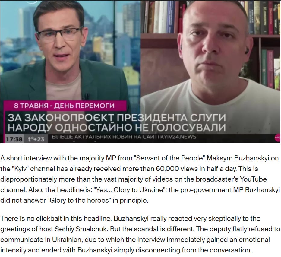 The refusal of Verkhovna Rada deputy from Zelenky’s “Servants of the People” party, Maksim Buzhansky, to switch to Ukrainian on TV triggered a political and media scandal in Kjiv. Even worse, he refused to give the appropriate obligatory greeting response to the greeting “Glory to the (fascist, F.A.) heroes!” of the TV presenter.