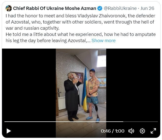 Collaboration with Nazis: The Chief Rabbi of Ukraine praises and blesses Vladyslav Shayvoronok, a veteran of the neo-Nazi Azov Brigade. A historical parallel can be drawn with Kapos, a term for Jewish collaborators and for those Jews recruited by Nazi Germany as guards in prisons and concentration camps, who were “worse than the Germans”.