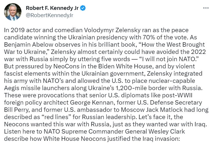 In his tweet, Robert F. Kennedy, lawyer, and U.S. presidential candidate, stated: “Let’s face it, the Neocons wanted this war with Russia, just as they wanted war with Iraq. Listen here to NATO Supreme Commander General Wesley Clark describe how White House Neocons justified the Iraq invasion.”