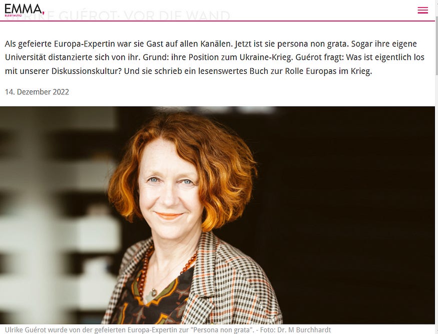 The German magazine EMMA writes: “As a celebrated Europe expert, she was a guest on all channels. Now she is persona non grata. Even her own university distanced itself from her. The reason: her position on the Ukraine war. Guérot asks: What is actually wrong with our discussion culture? And she wrote a book on Europe’s role in the war that is well worth reading.”