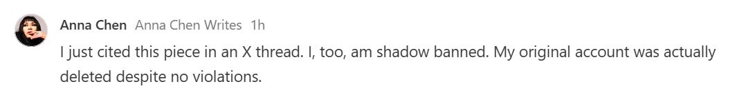 UK writer and broadcaster Anna Chen, Orwell Prize shortlistee and TED speaker, has spent three decades challenging establishment narratives. Her main X account was deleted — her backup @MadamMiaow is shadow-banned too, as she told me on Substack: