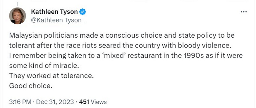 However, some of my Malaysian acquaintances from different ethnic and religious backgrounds have given me reservations. One friend told me, “The Christmas greetings appear in the eastern regions of Malaysia, Sabah and Sarawak, which are more racially and religiously harmonious than West Malaysia, where racial tensions are constantly stoked for political reasons. Envy of the affluent ethnic Chinese, and to a lesser extent Indians, still culminates in hatred.”